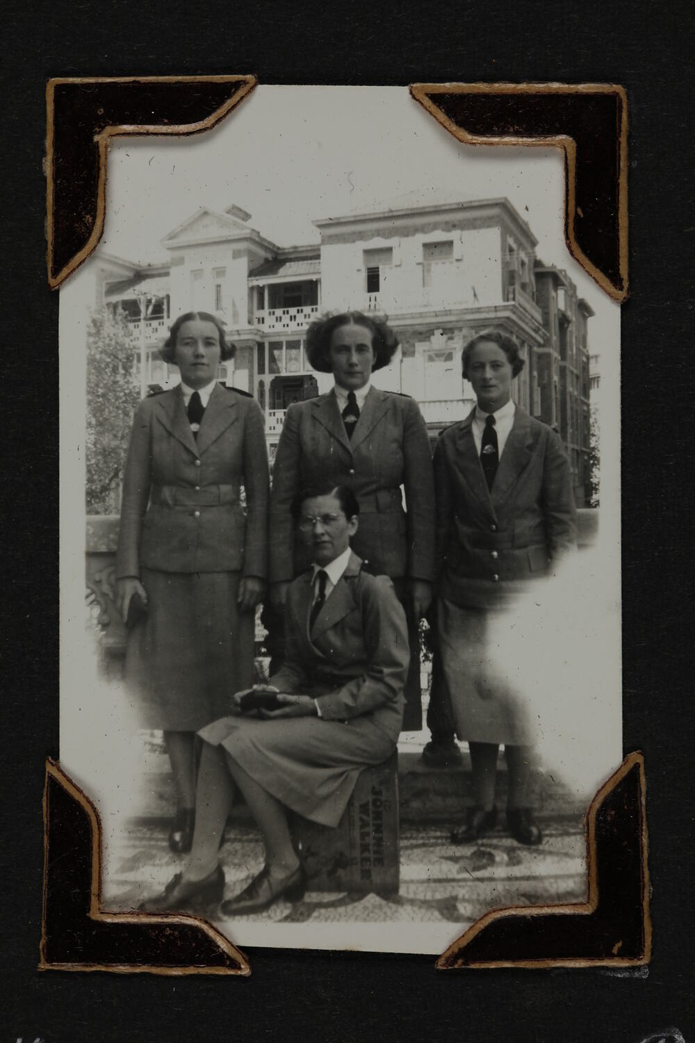 Portrait of four servicewomen posed on a hotel balcony in Bombay (Mumbai). One woman is sitting on a Johnnie Walker crate.