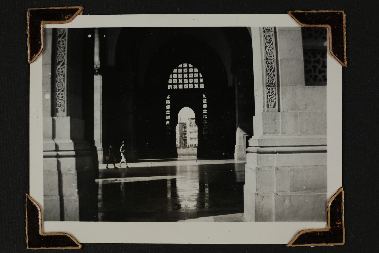 Hand written in white ink on the album page; 'THE GATEWAY OF INDIA. BOMBAY.'