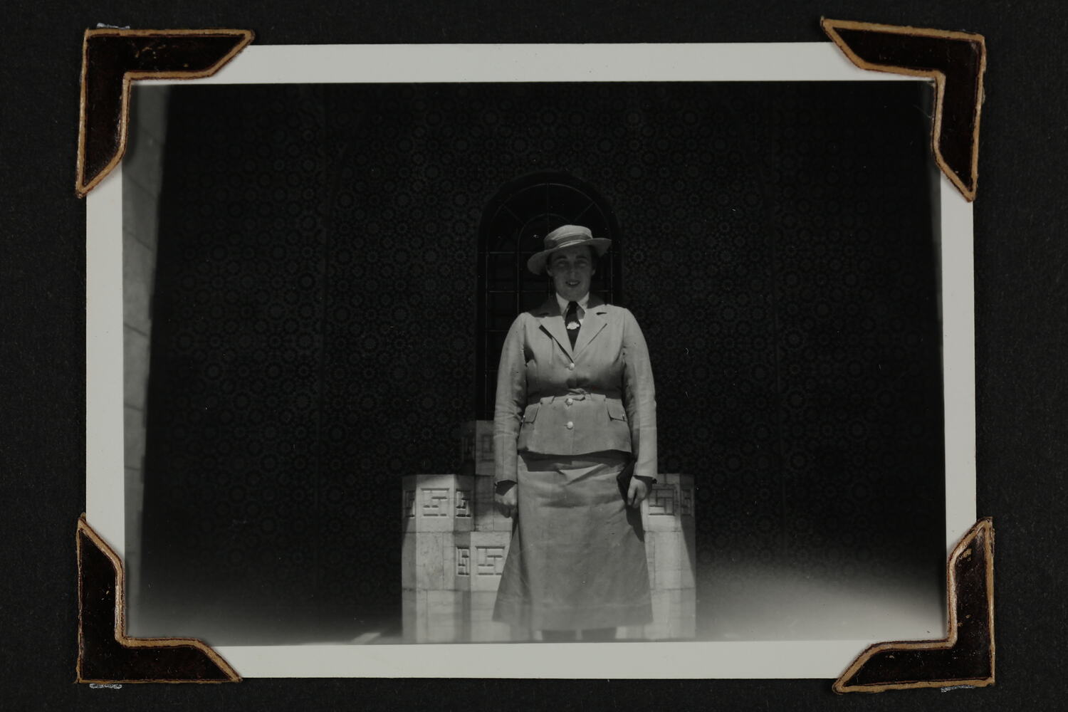 Black and white silver gelatin photograph contained in a photograph album. Photograph in mounted with brown photo corners.