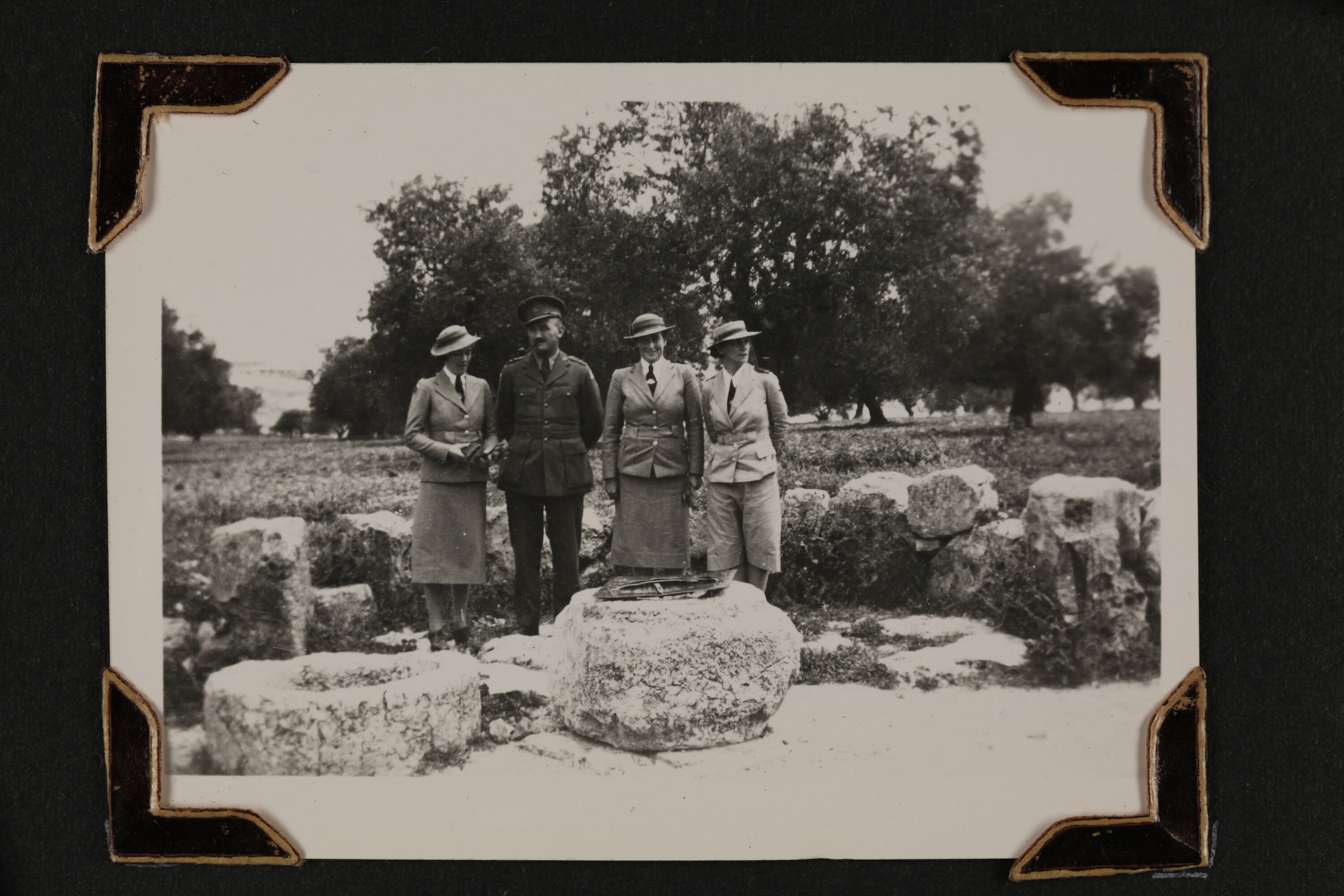 Hand written in white ink on the album page; 'NELL, HAROLD, ISABEL, SR. TREMBATH. / AT MIRIAM'S WELL ON THE WAY TO BETHLEHEM.'