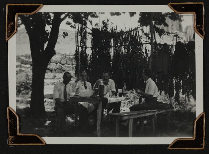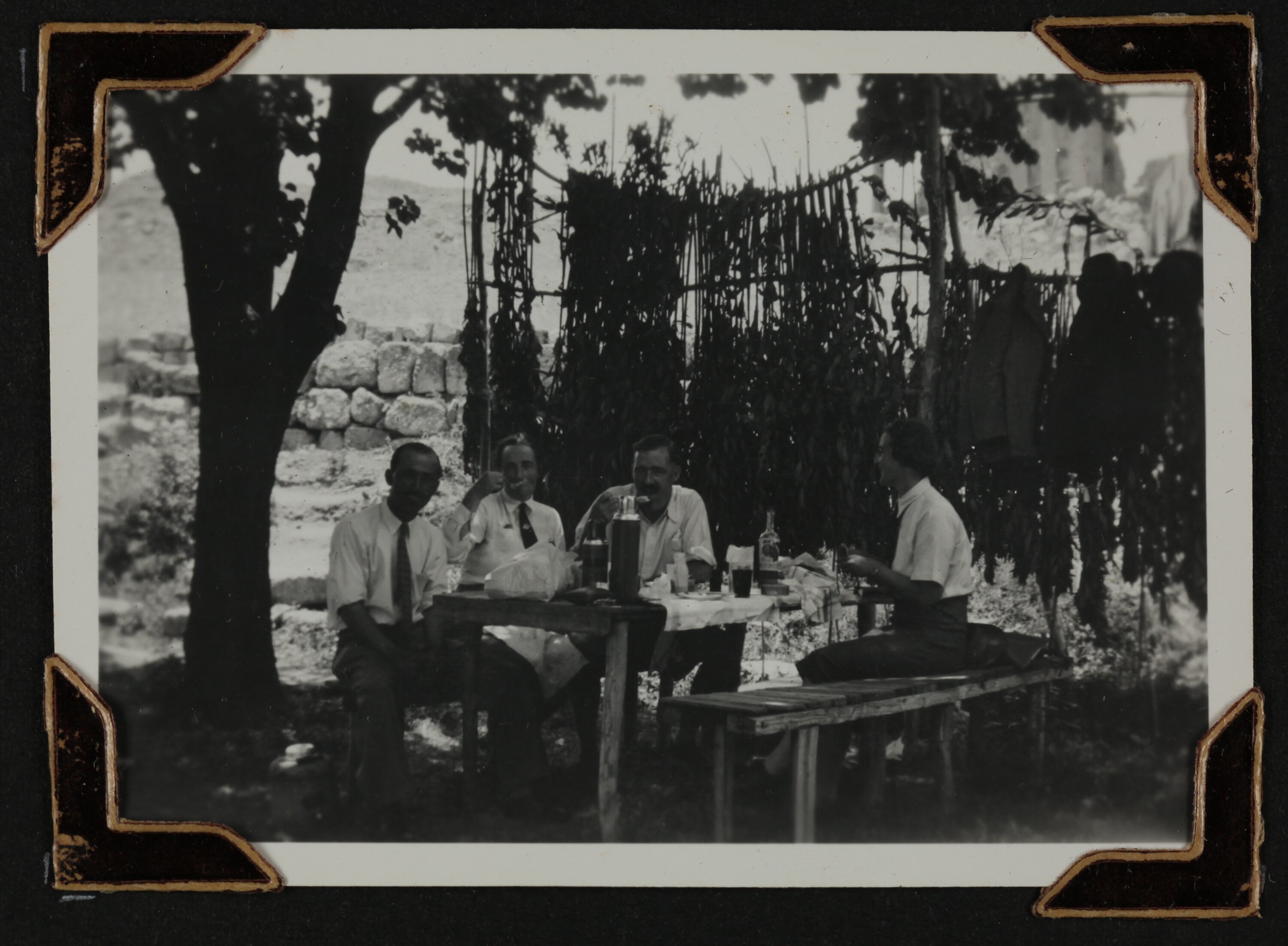 Hand written in white ink on the album page; 'FARMI. (THE ARAB DRIVER). ISABEL & MICHAEL (EATING PEARS). / AND MISS NICHOLAS.'