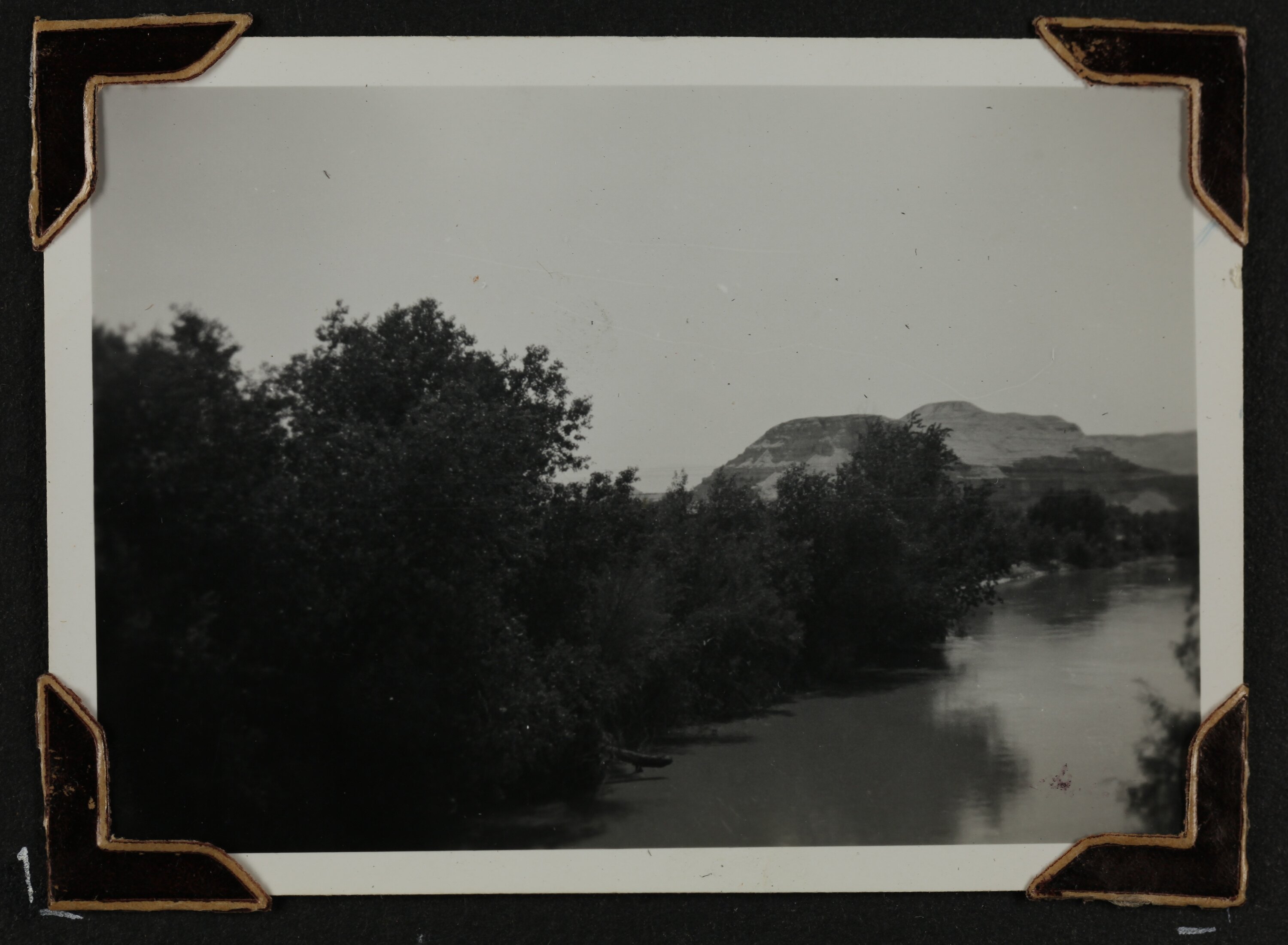 Black and white silver gelatin photograph contained in a photograph album. Photograph in mounted with brown photo corners.