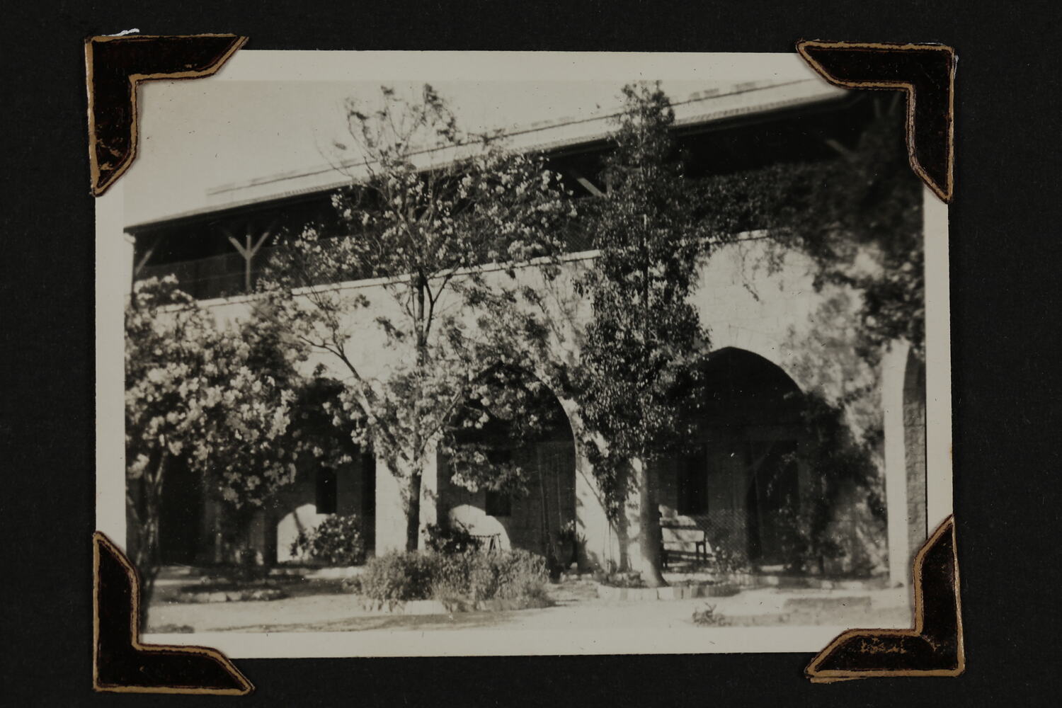 Black and white silver gelatin photograph contained in a photograph album. Photograph in mounted with brown photo corners.