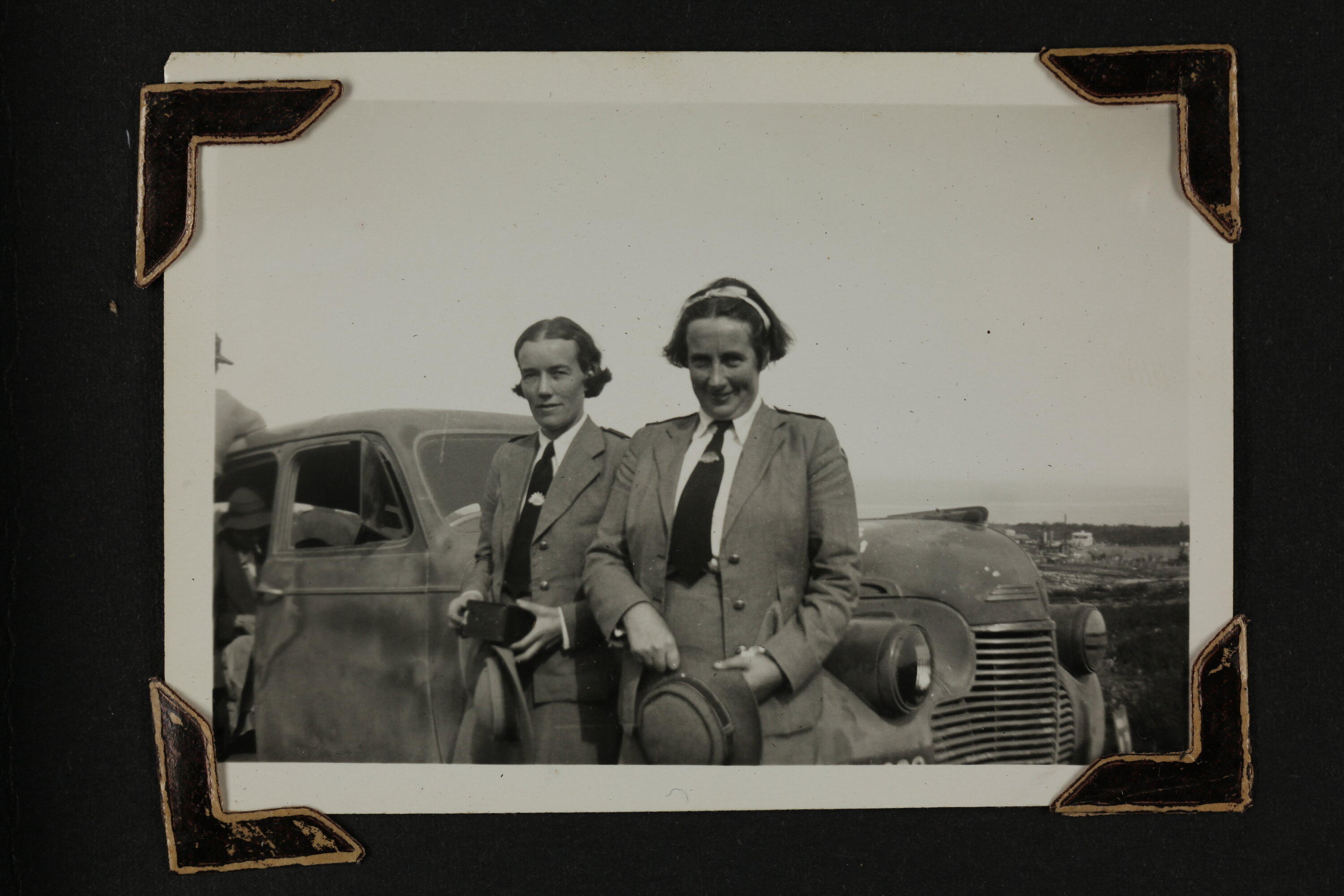 Sister Nell Duncanson and Sister Isabel Plante in uniform standing in front of a motor vehicle. Tripoli can be seen in the distance.