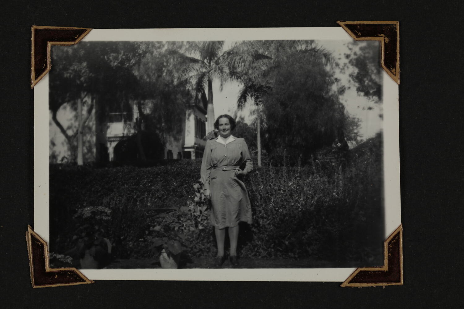 Black and white silver gelatin photograph contained in a photograph album. Photograph in mounted with brown photo corners.