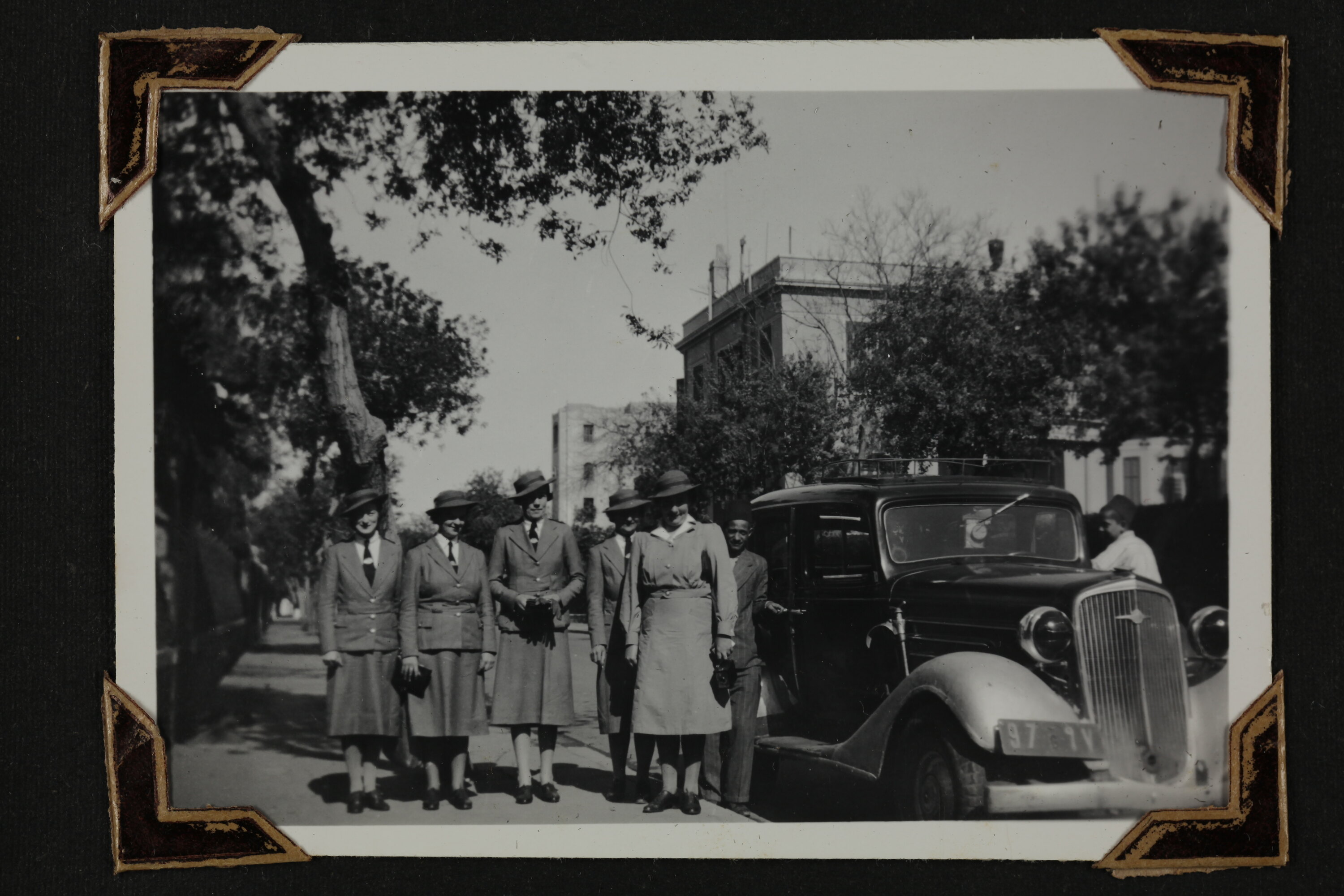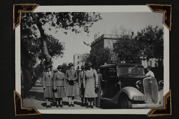 Five nurses standing next to a motor vehicle that is parked outside the convalescent depot at Cairo.