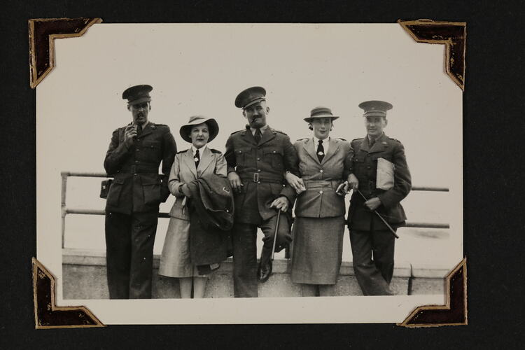 Five military servicemen and women (three men, two women) standing a long a railing at the Tel Aviv foreshore. From left to right: Mr Jock Comdray, Sister Norma Jones, Mr Harold Rich, Sister Isabel Plante, Mr Ted Dossetor.
