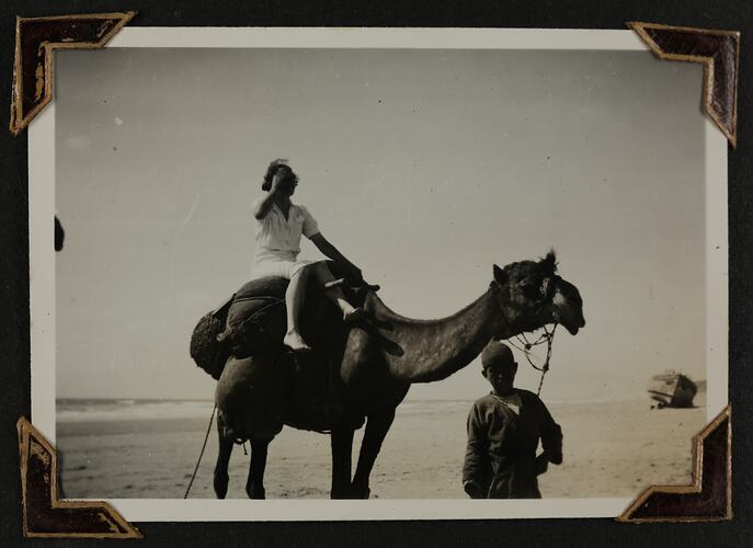 Sister Nell Duncanson riding a camel at Beit Jaum beach. A young boy is leading the camel on a rope.