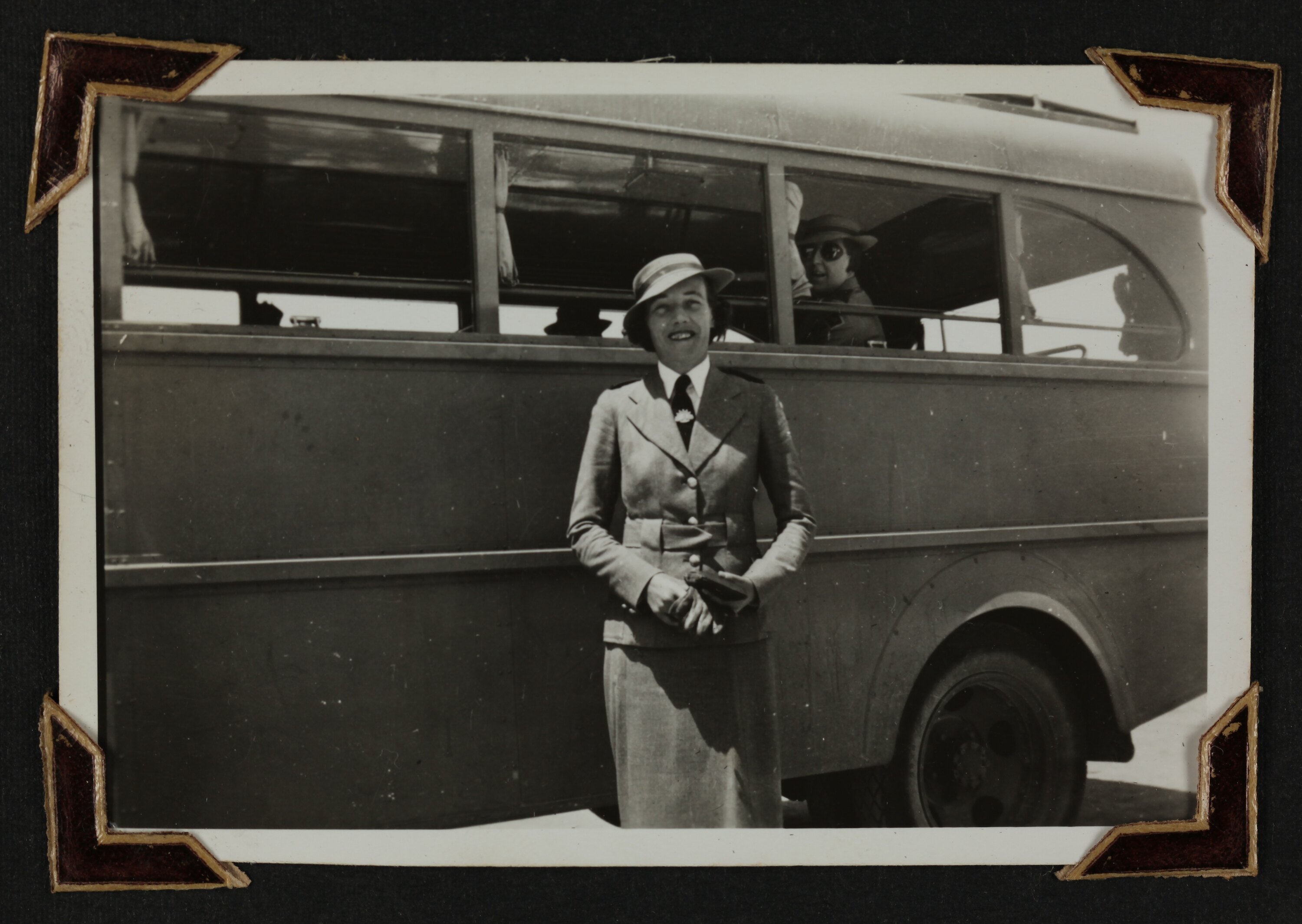 Sister Nell Duncanson wearing a military uniform, she is standing in front of a bus that is carrying passengers.