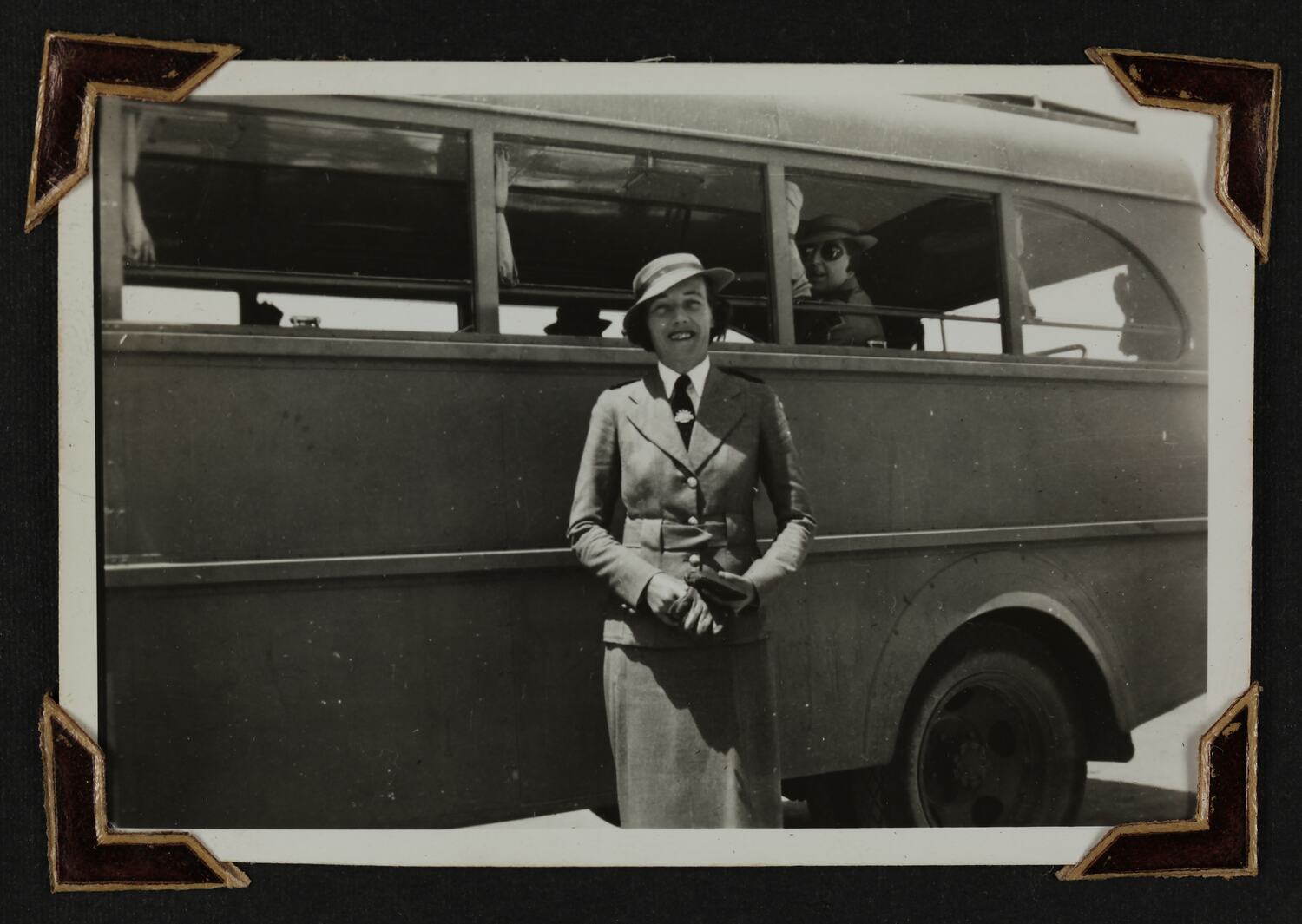 Black and white silver gelatin photograph contained in a photograph album. Photograph in mounted with brown photo corners.