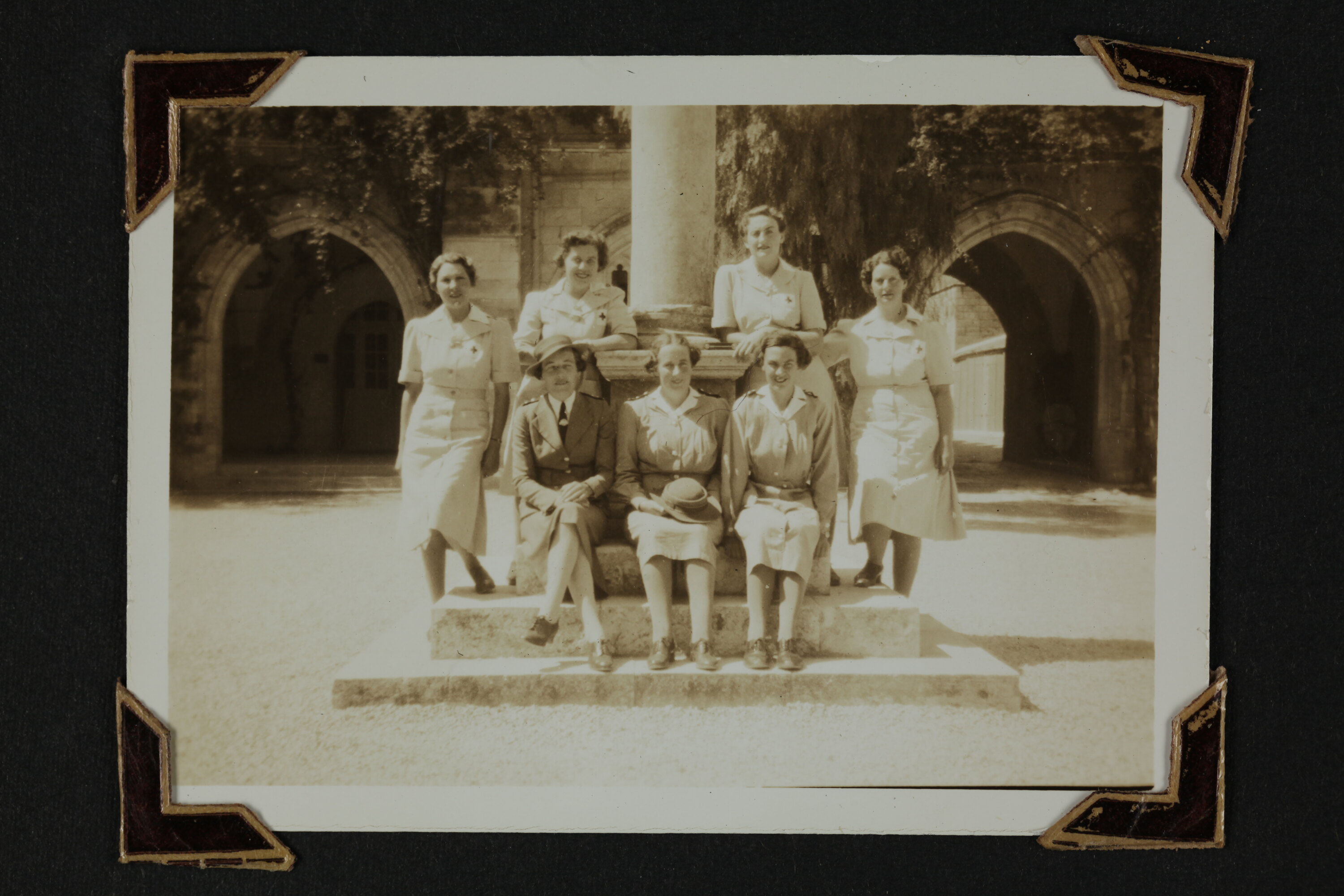 Seven nurses sitting around a pillar in a town square. Sister Nell Duncanson is sitting on the far left at the front and Sister Isabel Plante is sitting next to her.