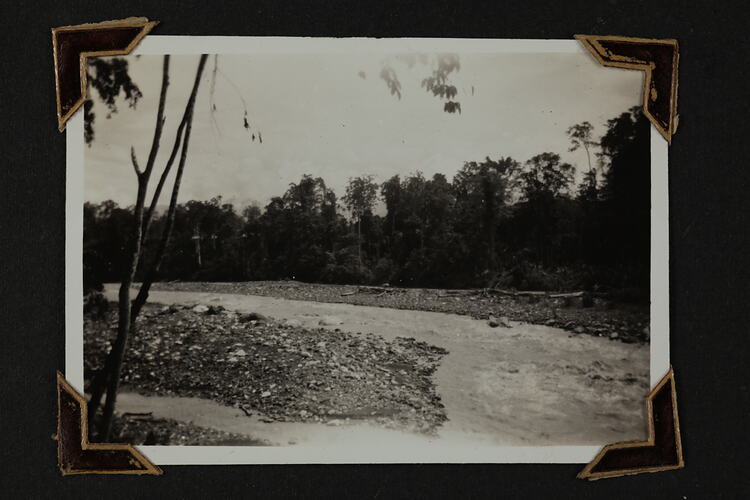 Black and white silver gelatin photograph contained in a photograph album. Photograph in mounted with brown photo corners.