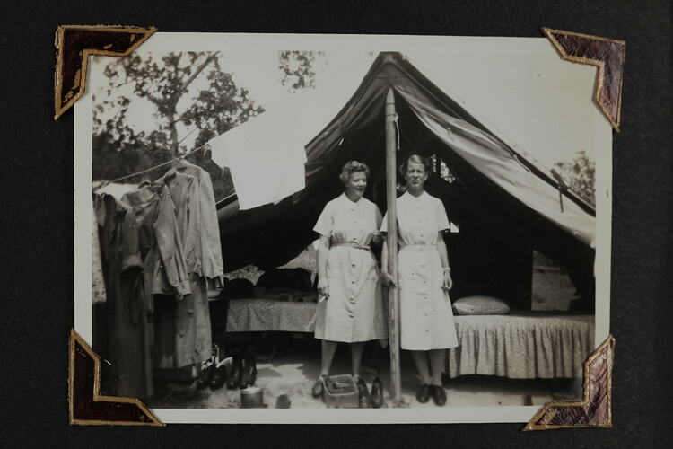 Two women standing in front of a military hospital tent at New Guinea. Inside the tent are two stretcher beds and to the left of them, clothes are hanging from the tents guy-rope.