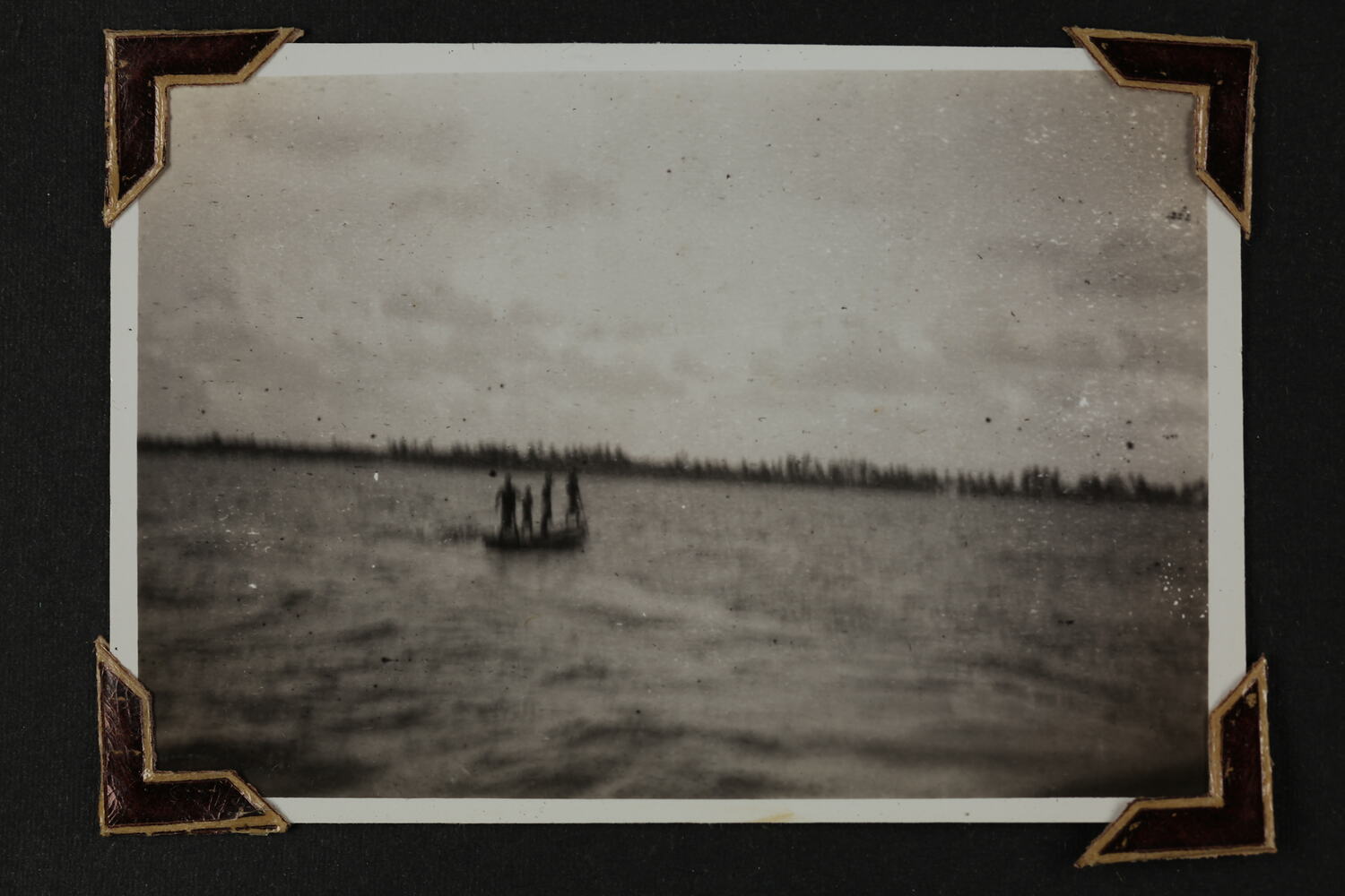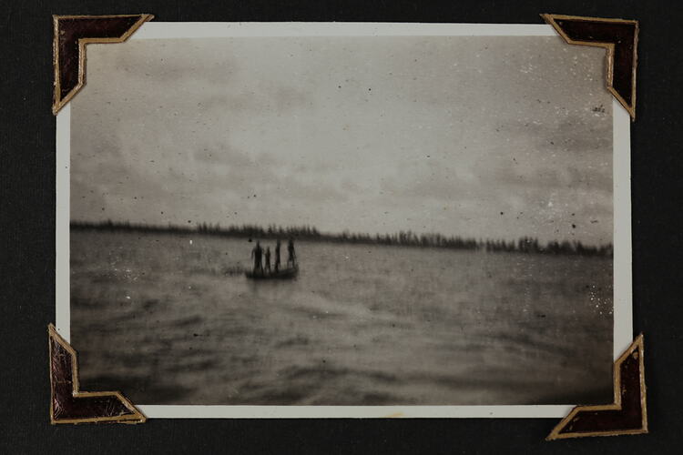 Black and white silver gelatin photograph contained in a photograph album. Photograph in mounted with brown photo corners.