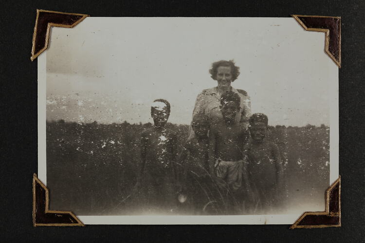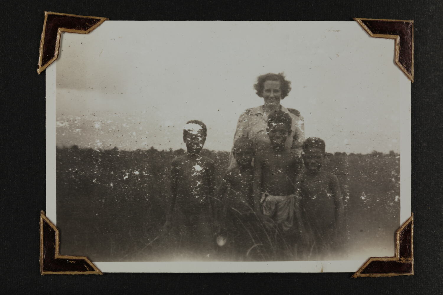 Black and white silver gelatin photograph contained in a photograph album. Photograph in mounted with brown photo corners.