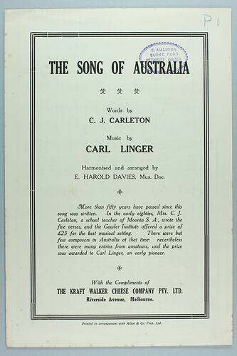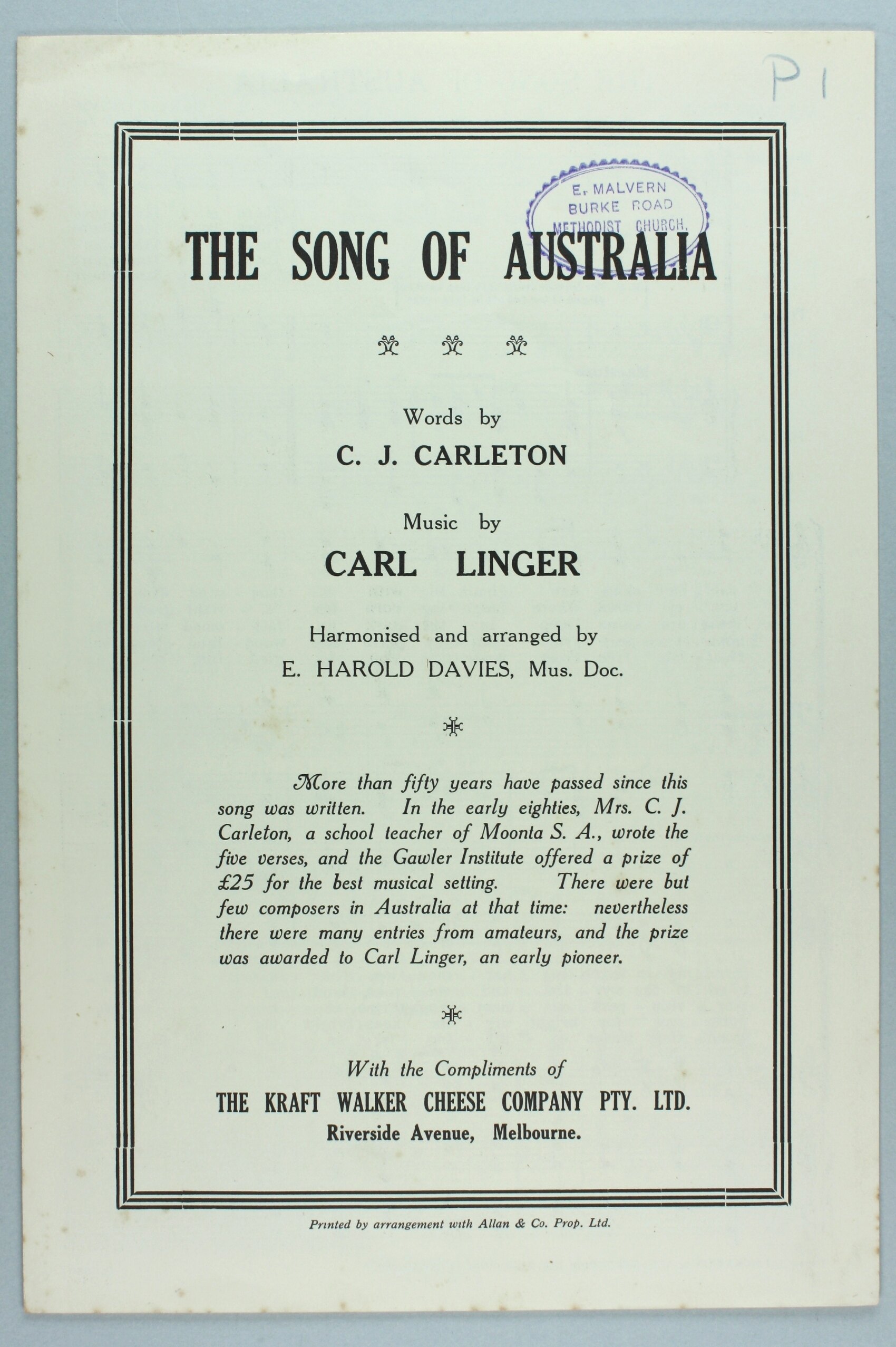 Printed on the front cover: 'THE SONG OF AUSTRALIA / Words by / C. J. CARLETON / Music by / CARL LINGER / Harmonised and arranged by / E. HAROLD DAVIES, Mus. Doc. / More that fifty years have passed since this / song was written. In the early eighties, Mrs. C. J. / Carleton, a school teacher of Moonta S.A., wrote the / five verses, and the Gawler Institute offered a prize of / £25 for the best musical setting. There were but / few composers in Australia at that time: nevertheless / there were many entries from amateurs, and the prize / was awarded to Carl Linger, an early pioneer. / With the compliments of / THE KRAFT WALKER CHEESE COMPANY PTY. LTD. / Riverside Avenue, Melbourne.' Stamped in the top right corner: 'E. MALVERN / BURKE ROAD / METHODIST CHURCH'