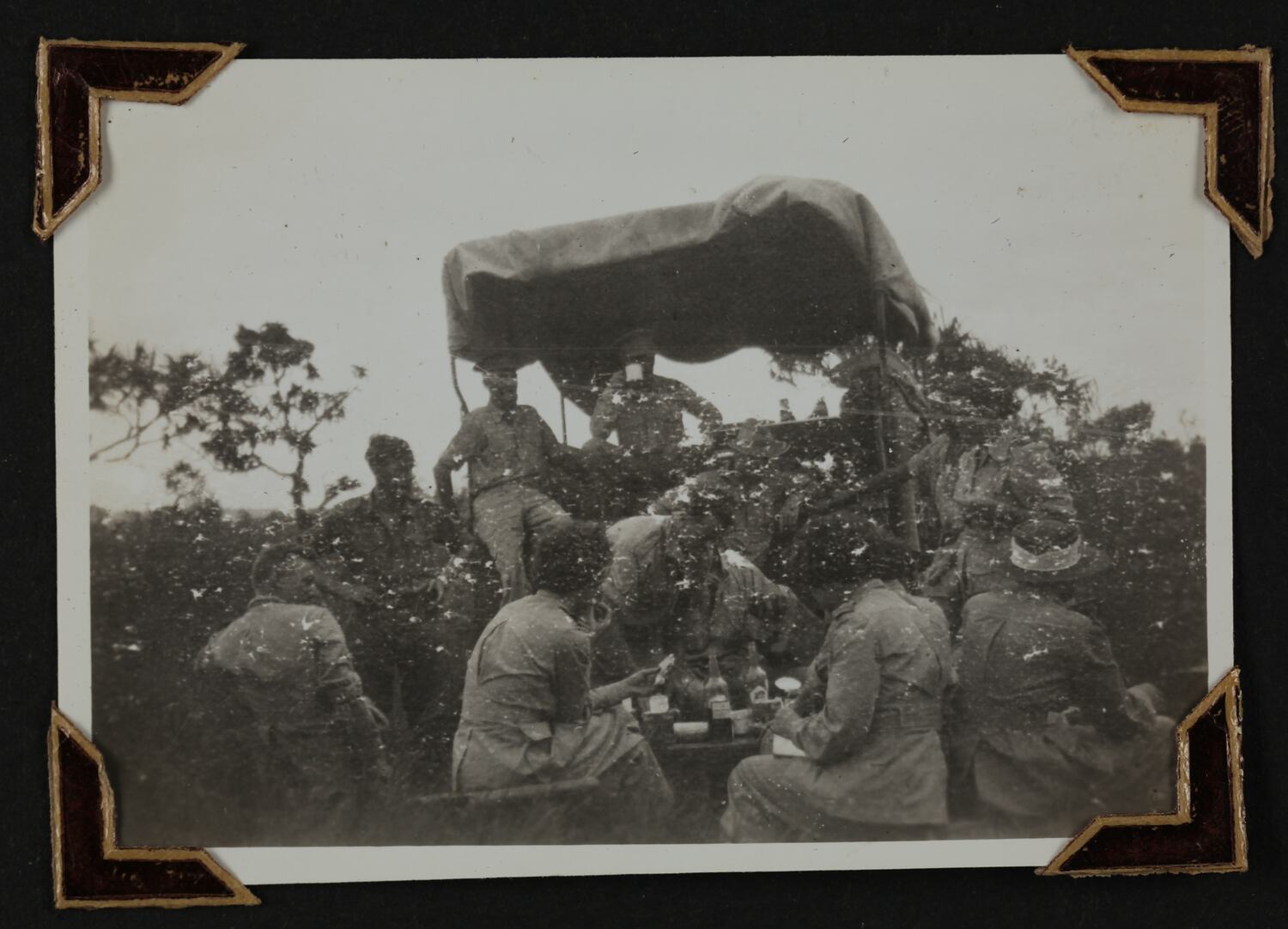 A group of nurses and servicemen sitting around a table, possibly playing cards. The table is set up in front of a military vehicle.