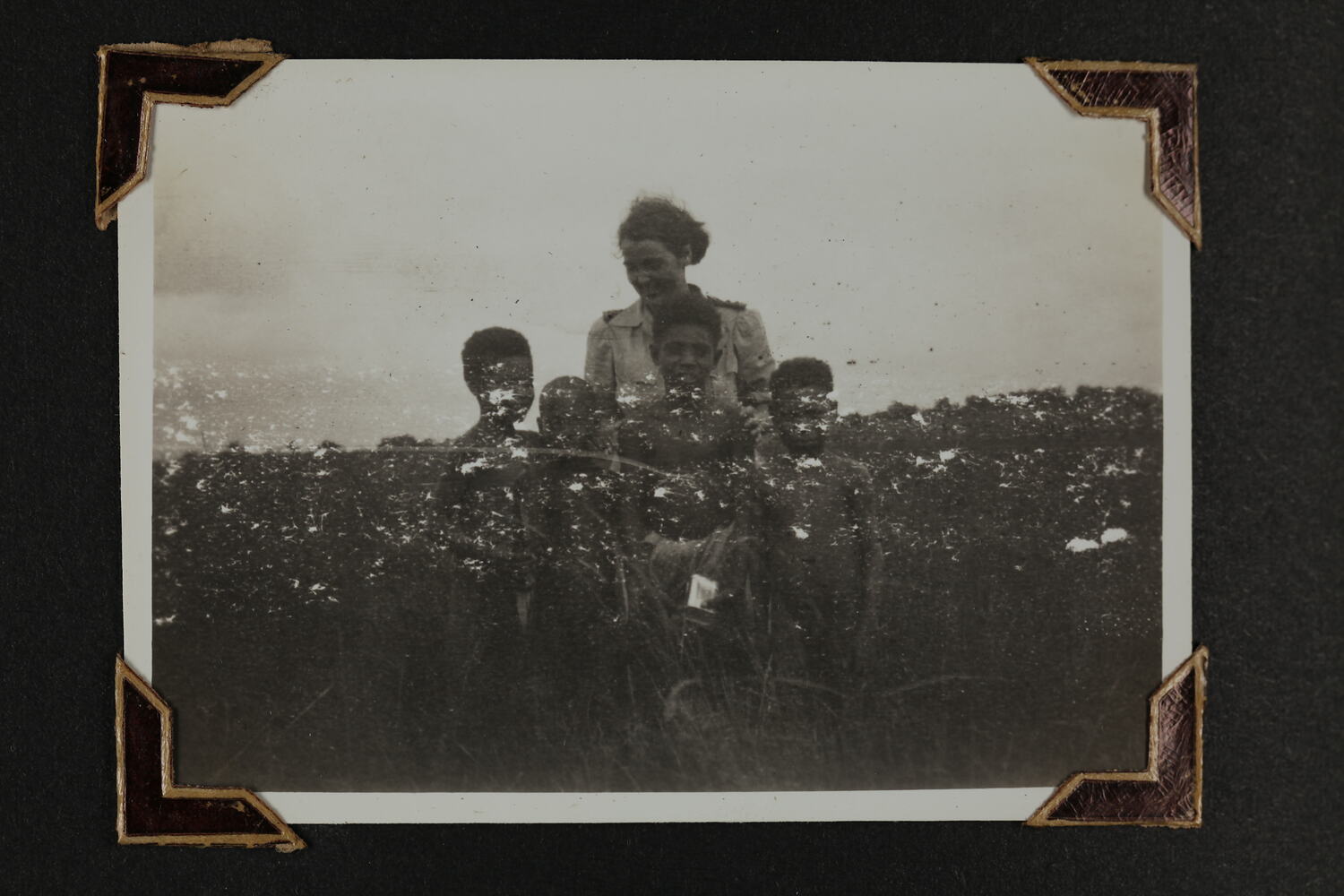 Black and white silver gelatin photograph contained in a photograph album. Photograph in mounted with brown photo corners.