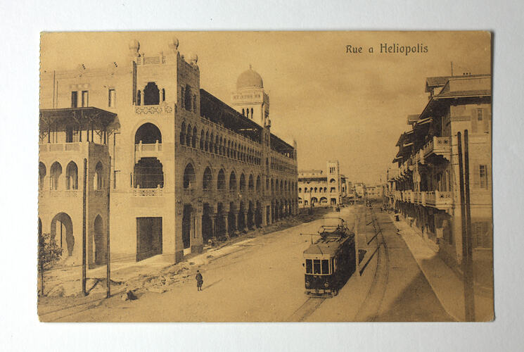 Sepia-toned postcard showing street scene, inscribed 'Rue a Heliopolis' (street in Helipolis). Helipolis is a suburb of Cairo. The modern suburb of Heliopolis was developed in 1905 by the Heliopolis Oasis Company as an upscale district in north-eastern Cairo. According to the written inscription on the back, the postcard shows the 'electric cars' that ran between Cairo and Heliopolis.