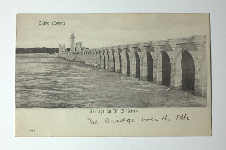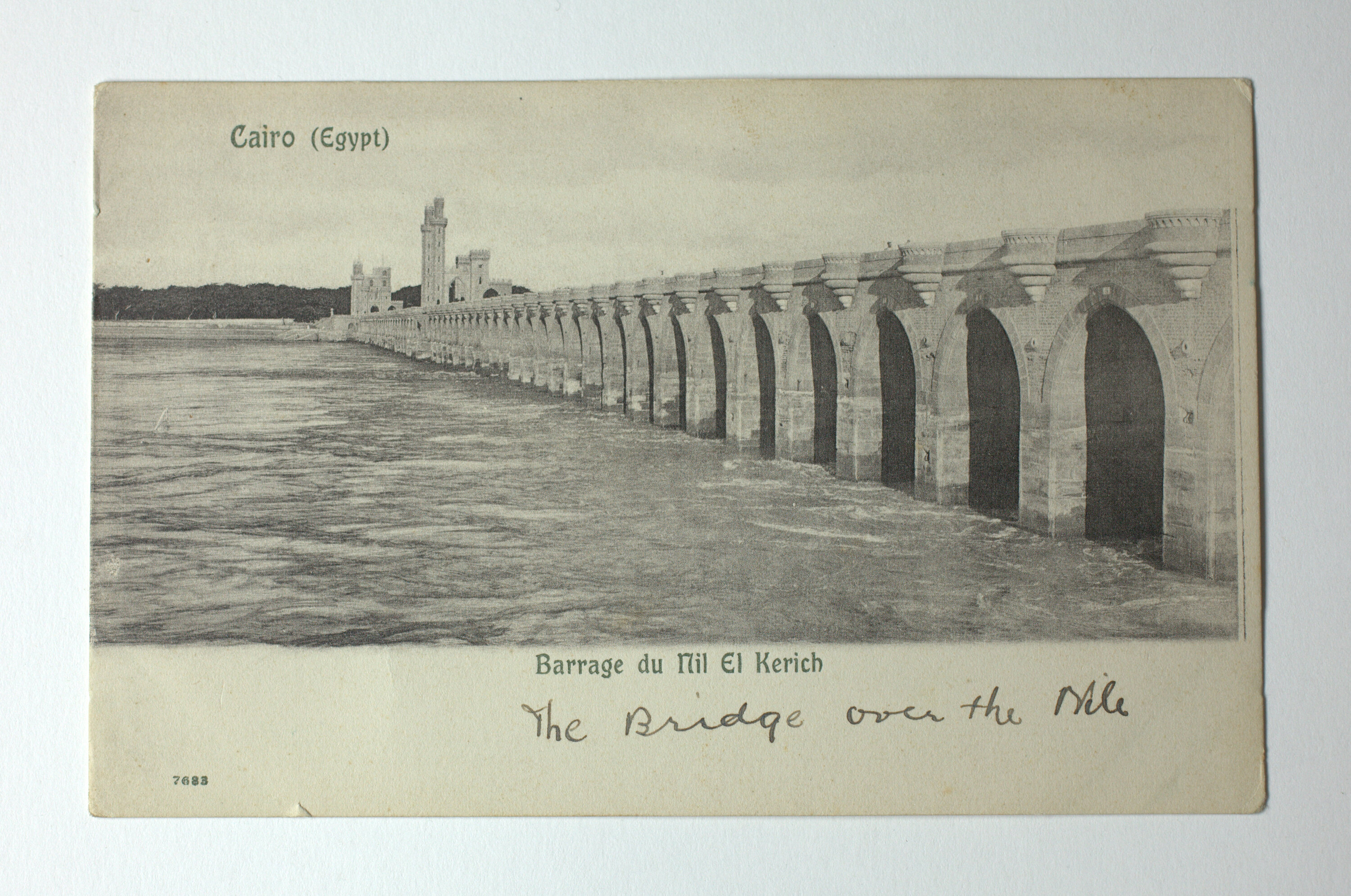 Printed in black ink on the front of the postcard in the upper left corner: 'Cairo (Egypt)' Printed in black ink on the front of the postcard: 'Barrage du Nil El Kerich' Hand-written in black ink on the front of the postcard, below the above inscription: 'The Bridge over the Nile' Printed on the back of the postcard along the top margin: 'L'adresse seule doit être dorite de ce côté' Printed on the back of the postcard: 'UNION POSTALE UNIVERSELLE / EGYPT / CARTE POSTALE'