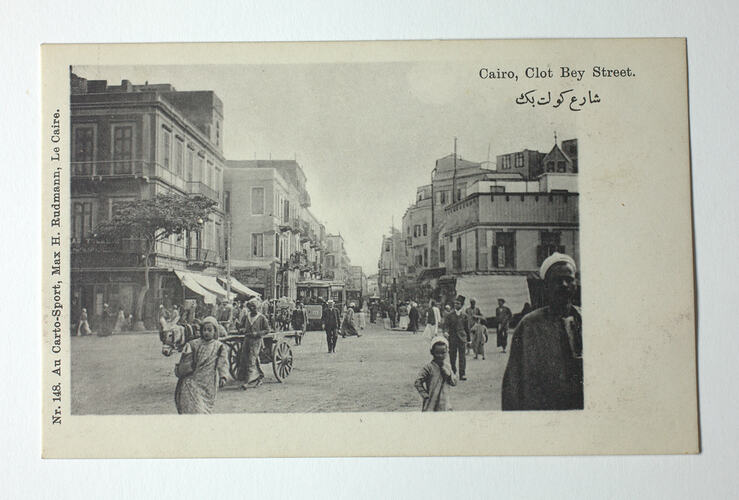 Printed in black ink on the front of the postcard in the top right corner: 'Cairo, Clot Bey Street. / (Arabic inscription)' Printed in black ink on the front of the postcard along the left margin: 'Nr. ? Au Carto-Sport, Max H. Ruddman, Le Caire' Printed on the back of the postcard along the top margin: 'L'adresse seule doit être dorite de ce côté' Printed on the back of the postcard: 'UNION POSTALE UNIVERSELLE / EGYPT / CARTE POSTALE'