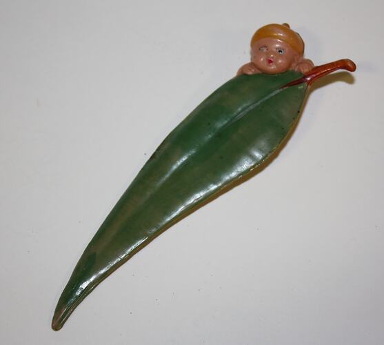 A small plastic doll made in the likeness of a May Gibbs 'wattle baby' wearing a yellow hat and shown peering over the top of a gumleaf from the shoulders up. The rest of the doll can be seen attached to the back of the gumleaf. Aside from the cap, the doll is naked. It is slightly compressed on the back.