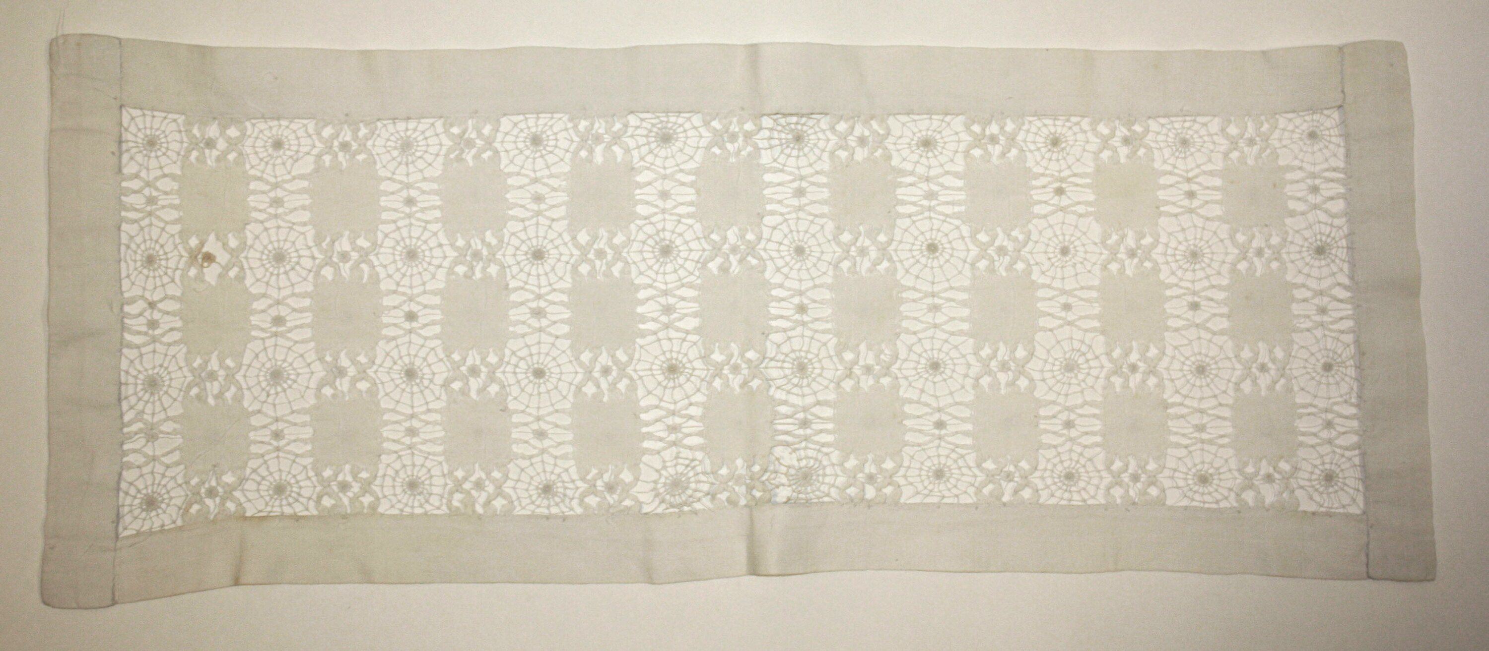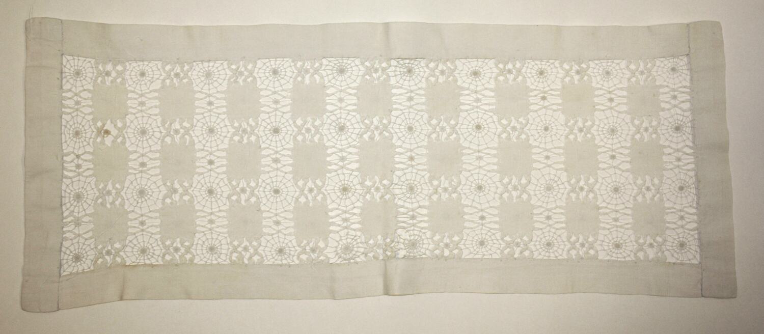 White drawn thread table runner made by Henrietta Gibson (nee Walpole), mother of Ada Henrietta. It is likely to have been made aroudn 1900 or in the first decade of the 20th century. The runner was acquired by the Museum with 'The Art of Drawn Thread', Metropolitan Art Series, vol.5, no.1, 1899 (HT 32792), which may have been used as a guide in making the work.