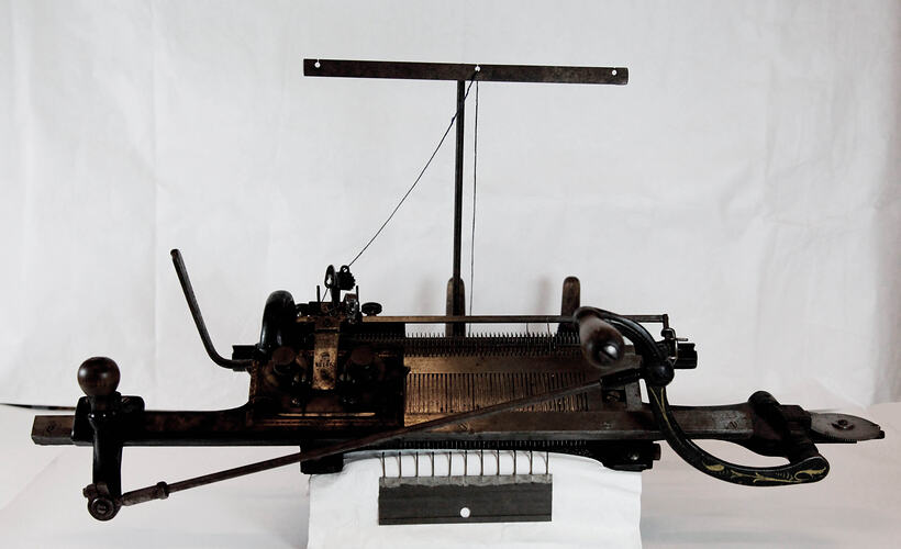 Knitting machines were enthusiastically advertised in the media in the early 20th century when this model was purchased, both for making family clothing and as a means of earning money. Hugo Wertheim advertised knitting machines as 'One of the most profitable means by which to earn a livelihood or supplement an income IN YOUR OWN HOME' (The Age, 4/2/1911, page 2).