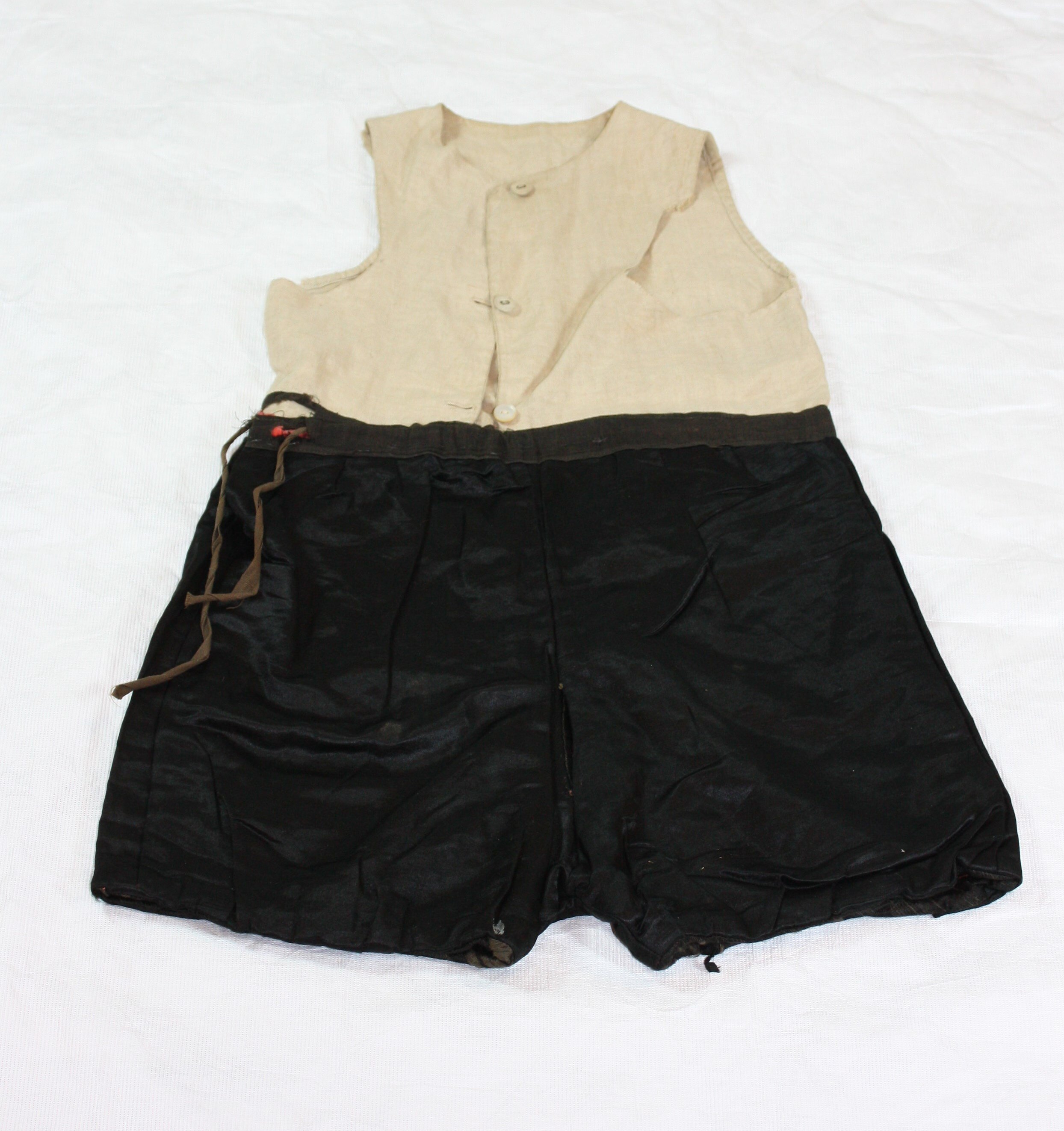 The shorts are black silk, lined with red fabric. They have drawstrings on the leg holes and at the waist. The leg holes show considerable wear. The shorts are sewn onto a sleeveless cream-coloured cotton vest with round neck and three cream-coloured buttons down the front, two fabric-covered and one of mother-of-pearl. Deep armholes to the front have been roughly hand-stitched - possibly they have been widened.