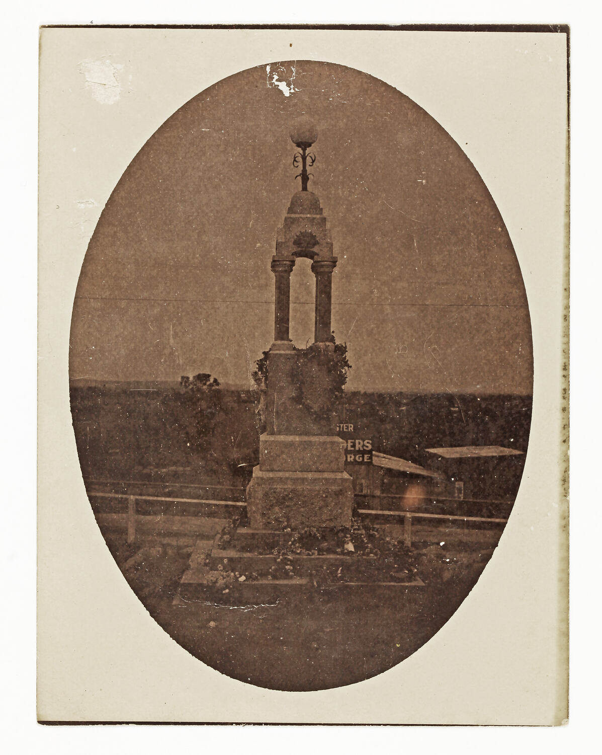 Photograph in oval mount of a World War I monument at Bunyip, Victoria. It consists of a cupola on four columns, with a column on a three-stepped base. The cupola is topped with a white ball, perhaps a light. Today the ball has been replaced with a cross. The monument is located at Main Road and High Street, Bunyip.