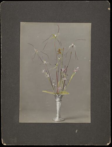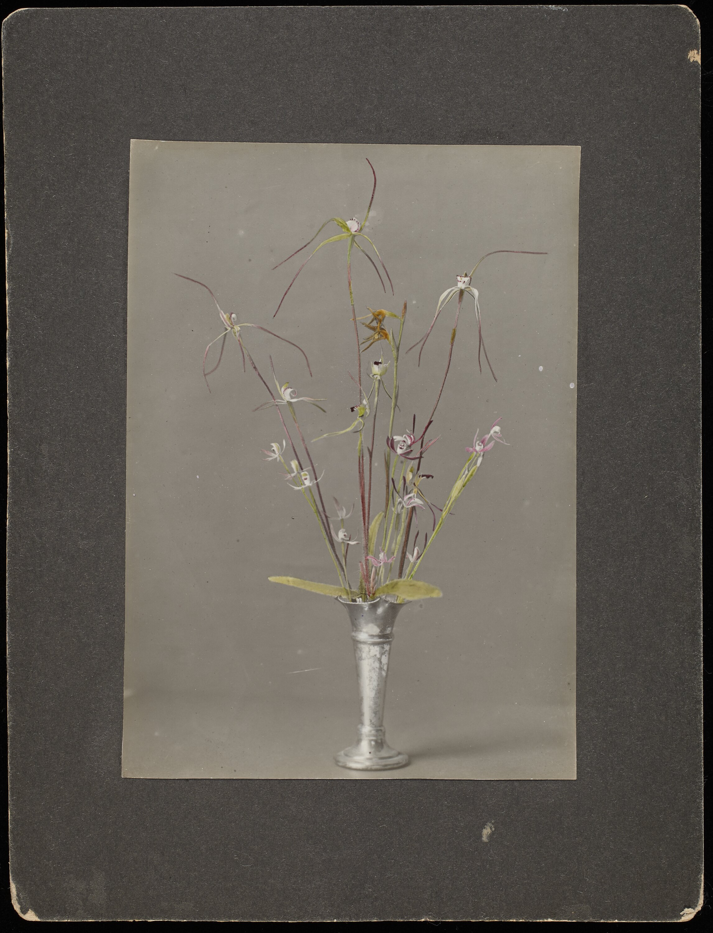 Part of a collection of images of plants and flowers taken by Robert Harvie: 18 glass positives, one hand coloured; 46 sets of stereographs, each set consisting of two individual, identical photographs [Note two sets only have one photograph] of selected handpainted photographs of flowers, a still life with fruit and a river scene.