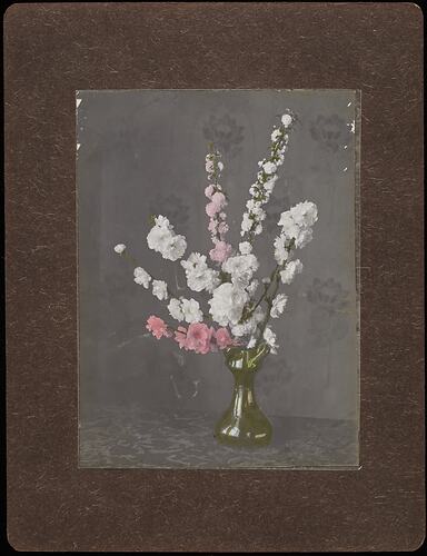 Part of a collection of images of plants and flowers taken by Robert Harvie: 18 glass positives, one hand coloured; 46 sets of stereographs, each set consisting of two individual, identical photographs [Note two sets only have one photograph] of selected handpainted photographs of flowers, a still life with fruit and a river scene.