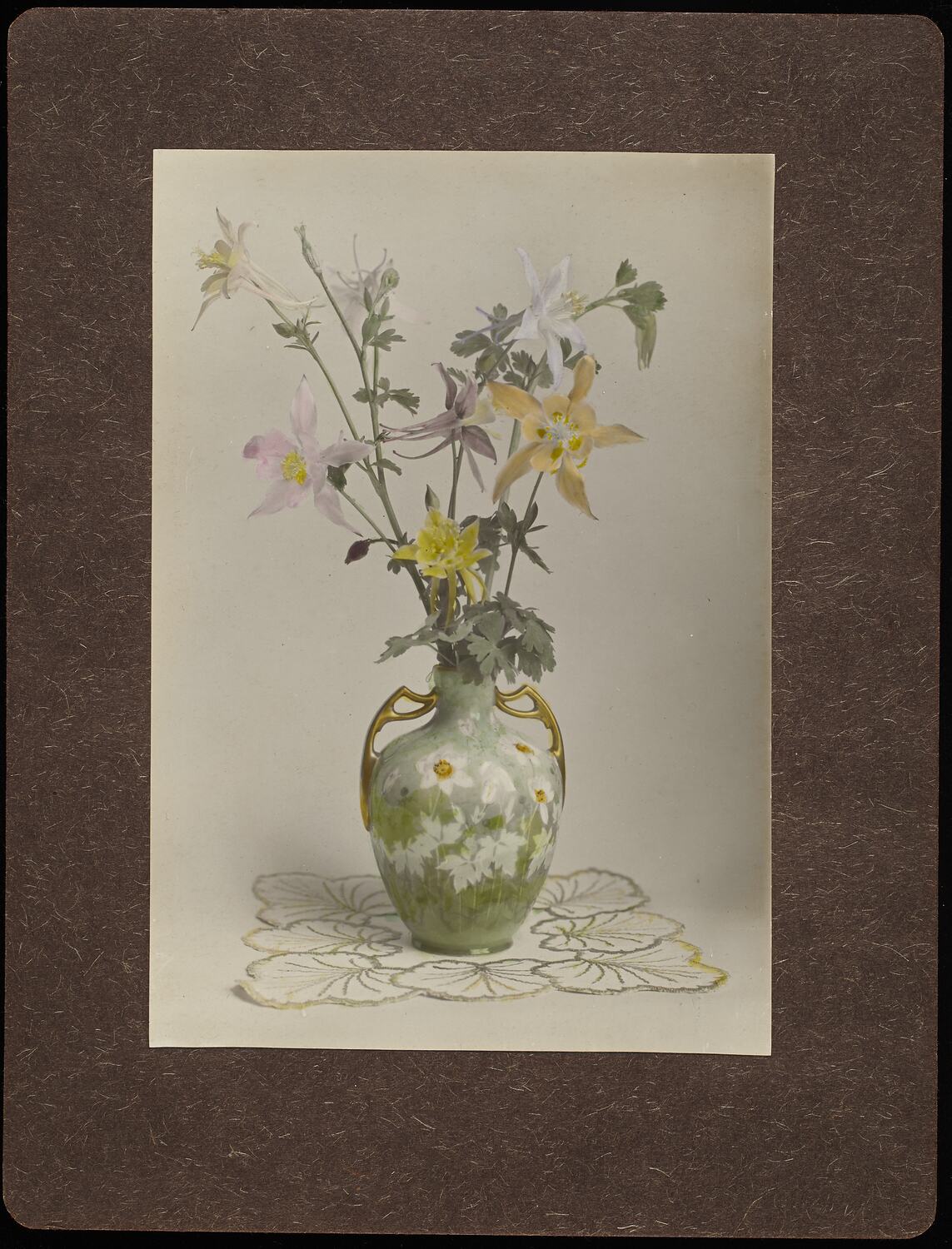 One of a pair of hand coloured stereographs of a still life with flowers.