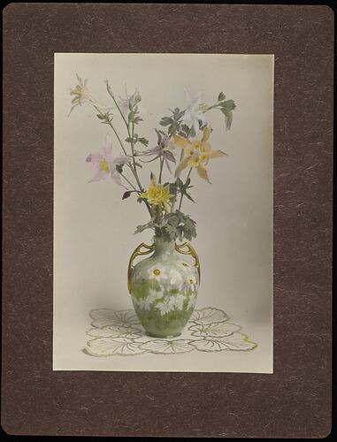 Part of a collection of images of plants and flowers taken by Robert Harvie: 18 glass positives, one hand coloured; 46 sets of stereographs, each set consisting of two individual, identical photographs [Note two sets only have one photograph] of selected handpainted photographs of flowers, a still life with fruit and a river scene.