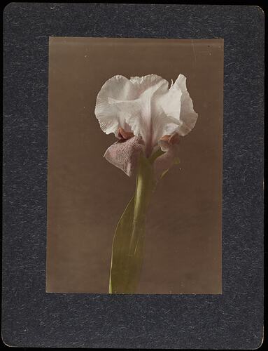 Part of a collection of images of plants and flowers taken by Robert Harvie: 18 glass positives, one hand coloured; 46 sets of stereographs, each set consisting of two individual, identical photographs [Note two sets only have one photograph] of selected handpainted photographs of flowers, a still life with fruit and a river scene.