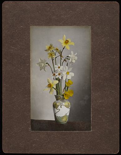 Part of a collection of images of plants and flowers taken by Robert Harvie: 18 glass positives, one hand coloured; 46 sets of stereographs, each set consisting of two individual, identical photographs [Note two sets only have one photograph] of selected handpainted photographs of flowers, a still life with fruit and a river scene.
