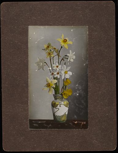 Right hand image of a still life with daffodils in a decorative vase.