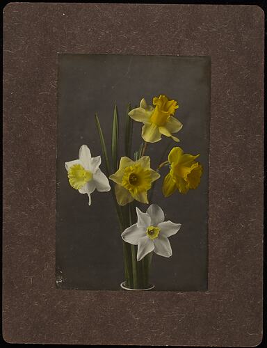 Part of a collection of images of plants and flowers taken by Robert Harvie: 18 glass positives, one hand coloured; 46 sets of stereographs, each set consisting of two individual, identical photographs [Note two sets only have one photograph] of selected handpainted photographs of flowers, a still life with fruit and a river scene.
