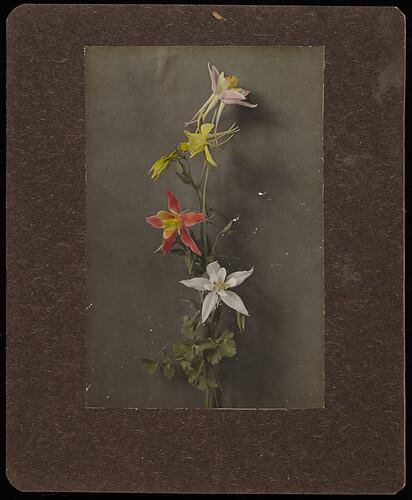 One of a pair of hand coloured stereographs of a still life of Columbine flowers.