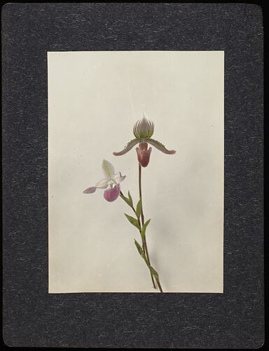 Part of a collection of images of plants and flowers taken by Robert Harvie: 18 glass positives, one hand coloured; 46 sets of stereographs, each set consisting of two individual, identical photographs [Note two sets only have one photograph] of selected handpainted photographs of flowers, a still life with fruit and a river scene.