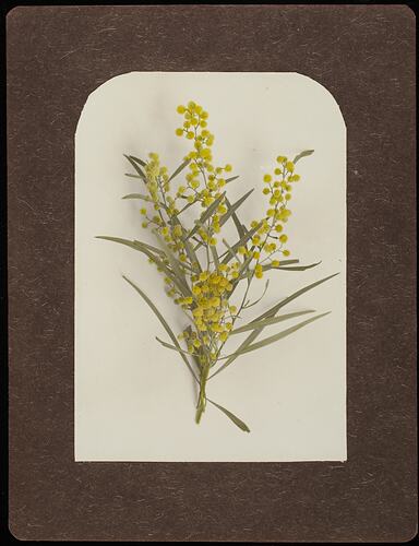 Left hand image of a still life with a branch of wattle.