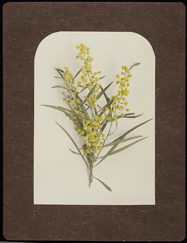Right hand image of a still life with a branch of wattle.