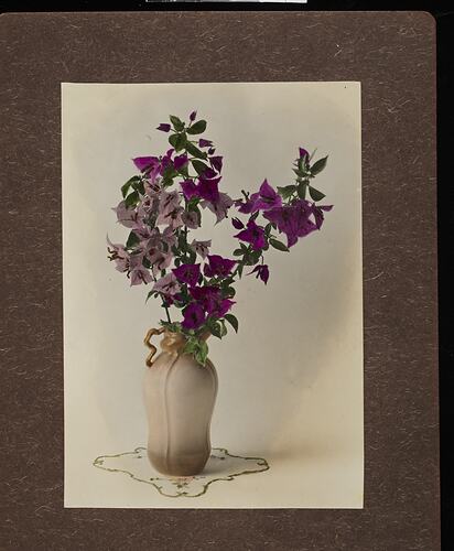 Part of a collection of images of plants and flowers taken by Robert Harvie: 18 glass positives, one hand coloured; 46 sets of stereographs, each set consisting of two individual, identical photographs [Note two sets only have one photograph] of selected handpainted photographs of flowers, a still life with fruit and a river scene.