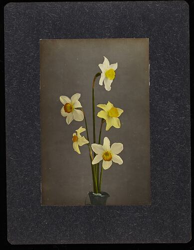 Part of a collection of images of plants and flowers taken by Robert Harvie: 18 glass positives, one hand coloured; 46 sets of stereographs, each set consisting of two individual, identical photographs [Note two sets only have one photograph] of selected handpainted photographs of flowers, a still life with fruit and a river scene.