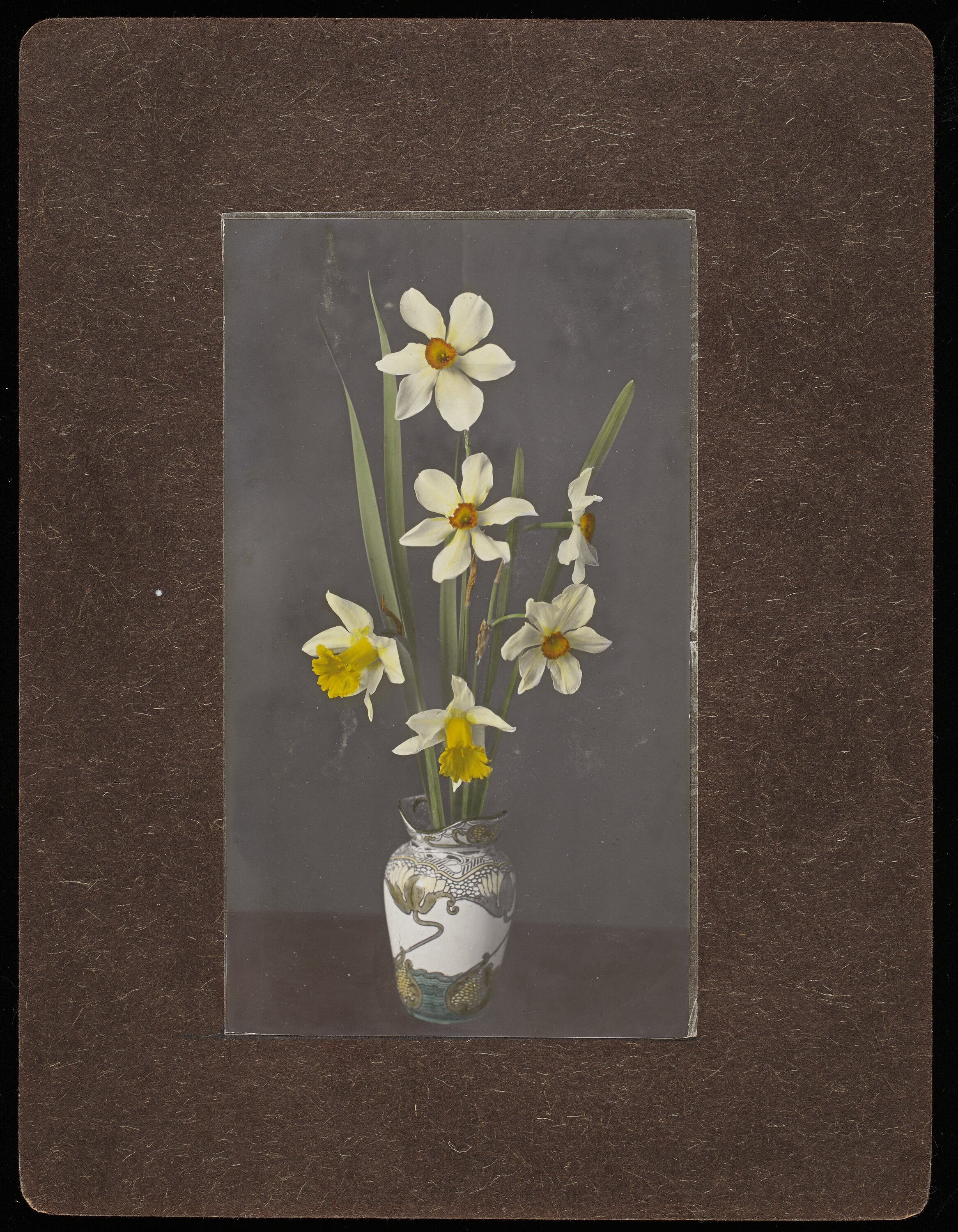 Left hand image of a still life with daffodils in a decorative vase.
