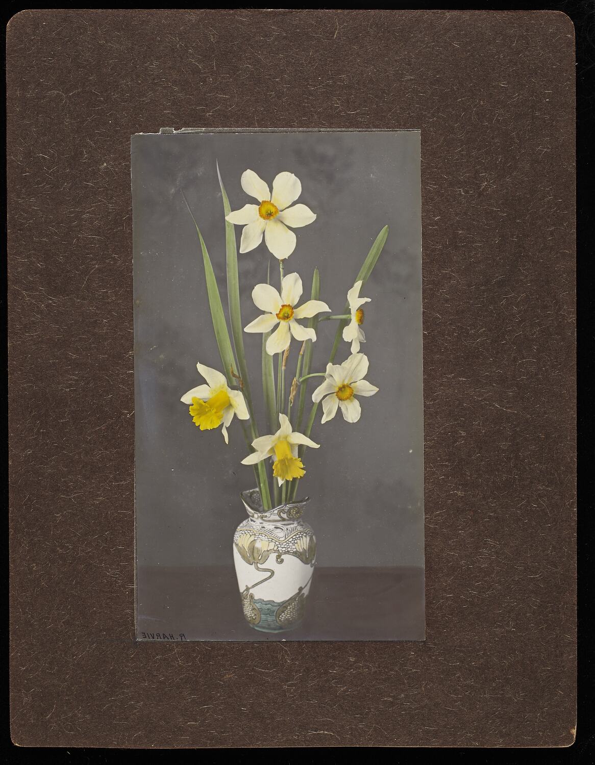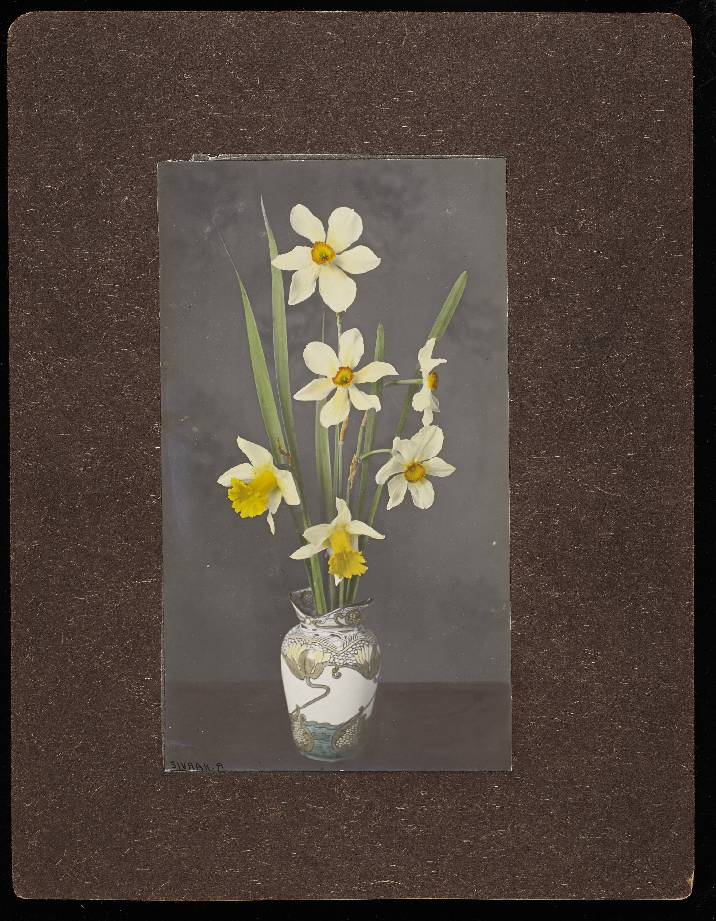 Hand written in blue pencil on the back of the photograph; 'R' Hand written in grey pencil with a stencil on the back of the photograph; 'R.HARVIE'