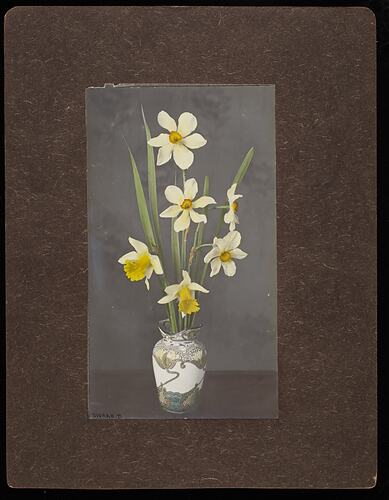 Part of a collection of images of plants and flowers taken by Robert Harvie: 18 glass positives, one hand coloured; 46 sets of stereographs, each set consisting of two individual, identical photographs [Note two sets only have one photograph] of selected handpainted photographs of flowers, a still life with fruit and a river scene.