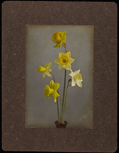 Part of a collection of images of plants and flowers taken by Robert Harvie: 18 glass positives, one hand coloured; 46 sets of stereographs, each set consisting of two individual, identical photographs [Note two sets only have one photograph] of selected handpainted photographs of flowers, a still life with fruit and a river scene.