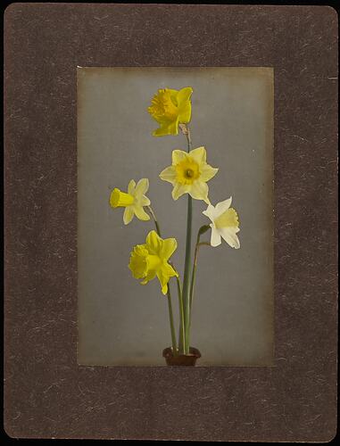 Part of a collection of images of plants and flowers taken by Robert Harvie: 18 glass positives, one hand coloured; 46 sets of stereographs, each set consisting of two individual, identical photographs [Note two sets only have one photograph] of selected handpainted photographs of flowers, a still life with fruit and a river scene.