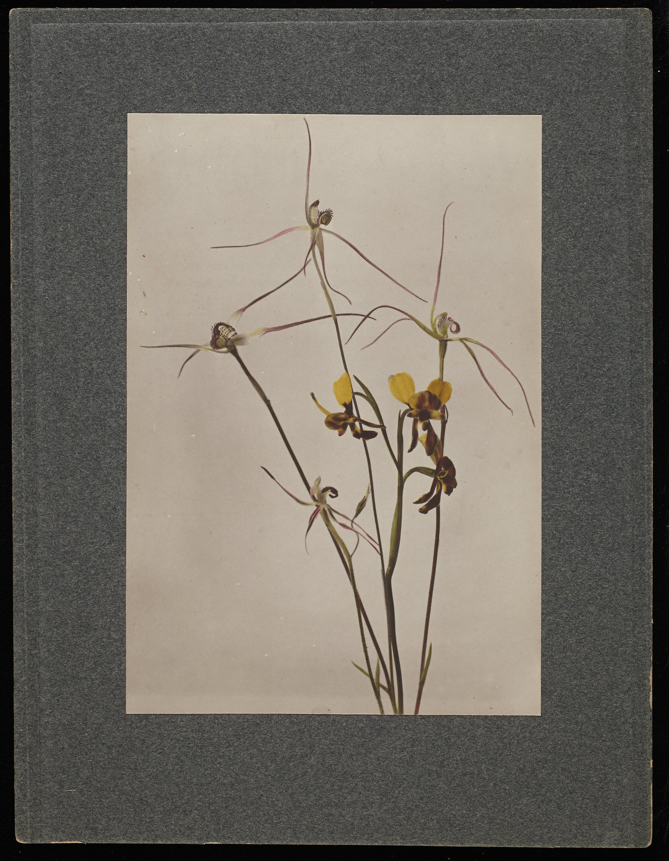 Part of a collection of images of plants and flowers taken by Robert Harvie: 18 glass positives, one hand coloured; 46 sets of stereographs, each set consisting of two individual, identical photographs [Note two sets only have one photograph] of selected handpainted photographs of flowers, a still life with fruit and a river scene.